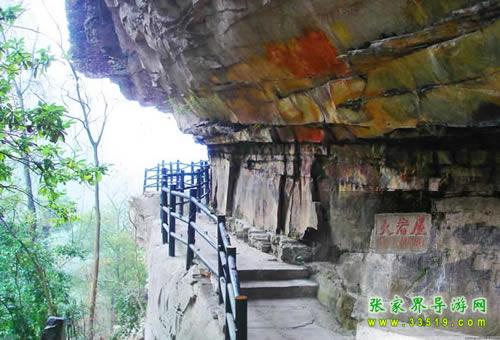 羅漢迎賓上方西南側(cè)石壁上,有一處空間高約3米、深1-3米、長20多米的巖屋,是絕妙的觀景臺。登臺南眺,遠(yuǎn)山如黛。近處左上側(cè)有石峰數(shù)座,倚天而列。北邊一峰類人,西向側(cè)面而立,似頭著兜鍪,身披甲胄,左臂下垂,傲視藍(lán)天,游人戲稱“獨(dú)臂武將”。巖屋下20米,一峰如葫蘆豎立,高約30米,直徑約10米,底、肚、頸、口俱全,附生的草木如花紋圖飾,一塊重達(dá)數(shù)噸的石板蓋于口上,稱”仙丹葫蘆“。對面一組山峰形如駱駝踽踽東行。駱駝前方是一山坡,有草無樹,夏日青似草原,秋天黃如大漠,駱駝?wù)蚰抢镒呷ァ?/p>