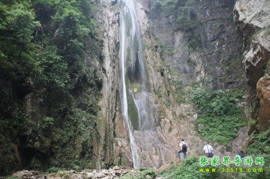 龍泉溪的盡頭,一懸崖高自余米,泉水自懸崖飛瀉,呈霧狀飄落谷底,形成瀑布。瀑高80米,上寬5米,下寬15米。左高55米懸崖處,有三節(jié)怪石凸出石壁,泉水跌落其上,形成煙霧,水汽氤氳。