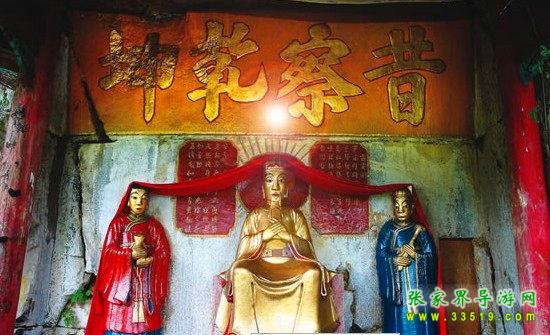 玉皇洞,又名雷電洞,座落在七洞之上,是代表天上一層的神洞,被譽(yù)為“天堂”。洞高4米,寬5米,深3米,洞內(nèi)雕鑿玉皇帝像,兩邊為金童玉女像。你看,這玉皇大帝頭戴金冠,身著龍袍,手執(zhí)乾坤袋,端坐正中,神態(tài)威然自若。身高1.9米。金童手捧丹瓶,玉女手執(zhí)琴柄,分別站在玉皇大帝的兩邊。洞上有匾額,為“昔察乾坤”4個(gè)大字。對(duì)聯(lián)已毀。