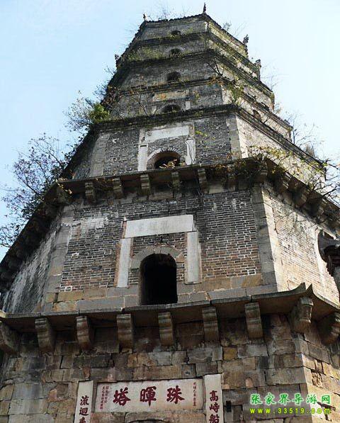 塔高10丈5尺,磚石結(jié)構(gòu),七層八棱,石階旋梯。正門西南向,上方漢白玉橫額鐫刻著斗大楷書“珠暉塔”三字,兩邊漢白玉雕刻楷書對聯(lián):“高峙船山遠綿學脈,流回耒水廣助文瀾”。塔基四周刻有飛禽走獸圖形,塔內(nèi)拱門嵌有石刻碑文,為江蘇學政王先謙撰寫、寧夏知府黃自文手書,原為6塊,現(xiàn)存4塊。塔前建有廊廡,僧房數(shù)楹。塔尖銅頂,映日生輝。