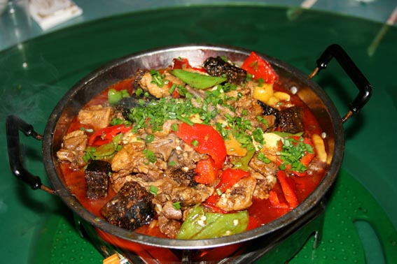 【 農(nóng)家菜豆腐 】 菜豆腐是鳳凰縣苗族和土家族常用的家菜和土菜。打豆腐之后,將剩下的較粗的豆汁留下,炒吃時(shí)一般拌白菜煮烹。菜豆腐煮好后,再在其上面放一上些火燒擂辣椒汁。吃時(shí)鮮嫩可口,對(duì)健身健胃,促進(jìn)血液循環(huán)和加速消化極有好處。菜豆腐是苗家、土家常食用的一種名菜,也可算為美味佳肴。