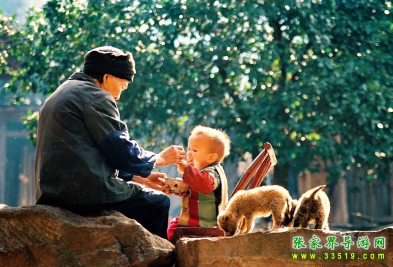 孩子們自從娘胎里出來,父母們就給備好了一首首童謠。在襁褓中時,有簡短的搖籃曲。“我的小寶貝,睡吧快快睡,你莫哭,快長大,我的小寶貝”,伴以“喲嗯”之類的喉音和鼻音??摁[的孩子在這低低的吟哦中,在這輕柔的春風(fēng)中,會緩緩的走入夢鄉(xiāng)。到孩子牙牙學(xué)語時,就會換上新的內(nèi)容。為讓孩子從小懂得廉恥,大人會教孩子《蟲蟲兒飛》:“打板板,逗蟲蟲兒,蟲蟲兒飛,飛到嘎兒(外公)去。嘎兒不趕狗,咬到蟲蟲兒的手;嘎兒不殺雞,蟲蟲兒不回去;嘎兒不打蛋,蟲蟲兒不吃飯;嘎兒不殺鵝,蟲蟲兒不過河。”(土家把孩子名字叫得賤,喊成“蟲蟲兒”)。在唱的同時手把手地教孩子做蟲蟲飛的動作。唱完后,又會用手指點點孩子的左右臉,刮一下孩子的鼻子,“這兒也丑,那兒也丑,鼻子刮豬油。”意思是好吃是丟臉的,蟲蟲兒可不能這樣。勤勞是做人的根本,也是土家人的傳統(tǒng)美德,“三歲看大,八歲看老”,大人會教些勤勞的童謠?!顿u豆腐》道:“一顆豆子圓又圓,推成豆腐賣成錢,別人講我生意小,小小生意賺大錢。”為讓孩子自小懂得親疏,教孩子《推磨》:“推磨拐磨,推的粑粑白不過。推粑粑,接嘎嘎,嘎嘎不吃娃娃的酸粑粑;推豆腐,接舅舅,舅舅不吃娃娃的酸豆腐;推合渣,接姨媽,姨媽不吃娃娃的酸合渣……”夏日的夜晚,一家人出來在月亮地里歇涼,有夜火蟲(螢火蟲)舉著火把飛來,母親會以夜火蟲打頭,以“一問一答”的聯(lián)句方式,考考孩子的記憶力:“夜火蟲,夜夜來,嘎婆接你吃茶來。什么茶?豆茶。什么豆?黃豆。什么黃?朱砂黃……”