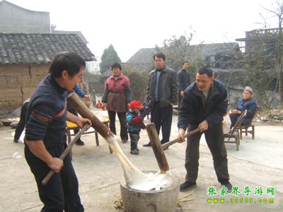 土家人民素有“二十八,打粑粑”的說法。每逢春節(jié)來臨,農(nóng)歷臘月末,家家都要打糯米糍粑,所謂打糯米糍粑,據(jù)當(dāng)?shù)剜l(xiāng)土志書記載:“系糯米飯就石槽中杵如泥,壓成團(tuán)形,形如滿月。大者直徑約尺5,尋常者約4寸許,3至8分厚不等。”打糯米糍粑是一項(xiàng)勞動(dòng)強(qiáng)度較大的體力活,一般都是后生男子漢打,兩個(gè)人對站,先揉后打,即使冰雪天也要出一身汗。做粑粑也很講究,手粘蜂臘或茶油,先出砣,后用手或木板壓,要做得玉圓光滑,講究美觀。