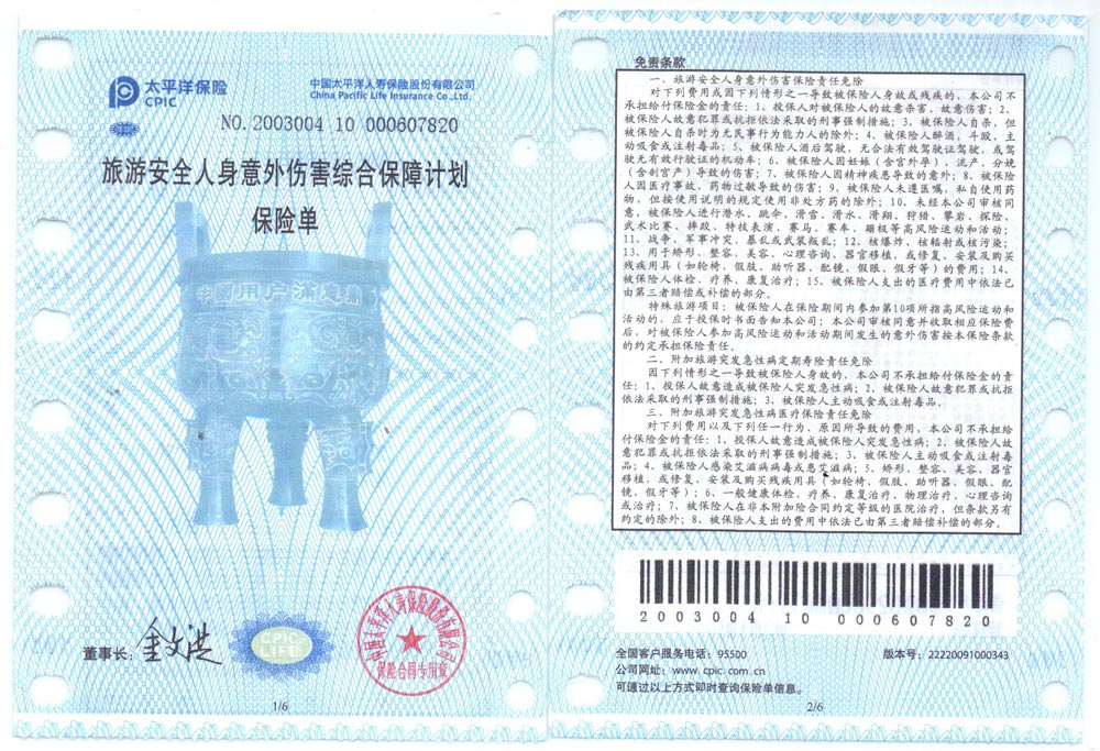 1、旅行社責(zé)任險;(從游客上了我社的安排的接待交通工具時到離開我們安排的接待交通工具時為止,不含客人來回湖南張家界地區(qū)的火車和飛機上的時間段);