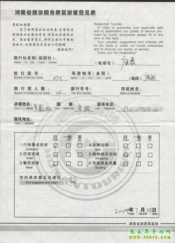 2009年7月15日辛先生一行10人質量接待反饋單: