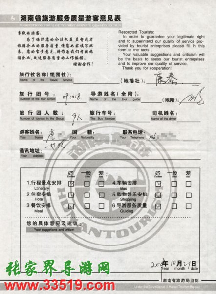 2009年10月18日唐先生一行9人接待質(zhì)量反饋單:
