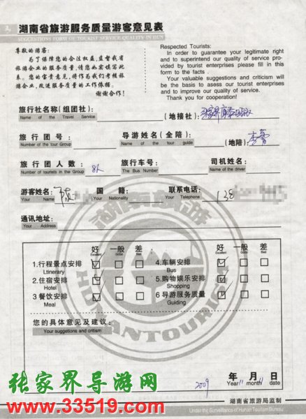 2009年11月11日陳先生一行8人旅游接待質(zhì)量反饋單: