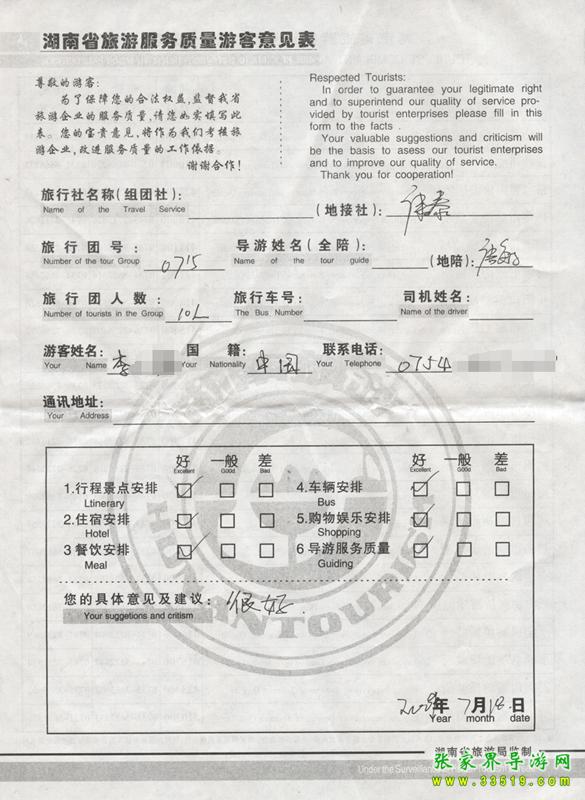 2009年7月15日李女士一行10人質量接待反饋單: