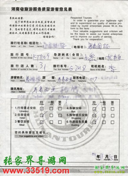2009年11月9日馬來(lái)西亞駱先生一行31人旅游接待質(zhì)量反饋單: