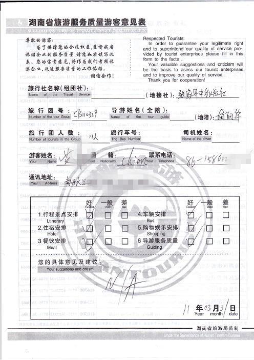 2011年3月31日黃先生一行11人旅游質(zhì)量意見反饋