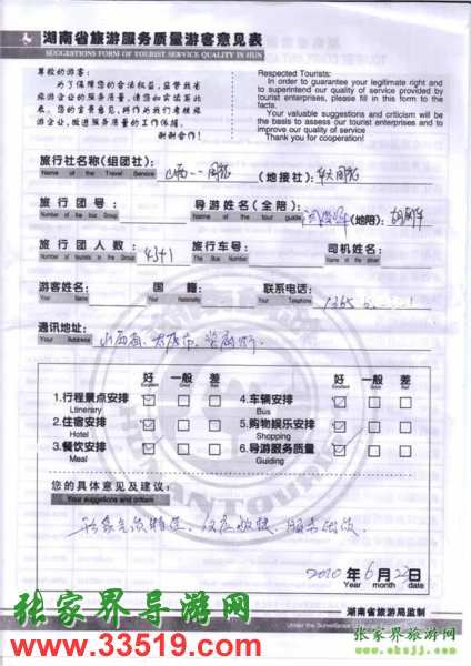 2010年6月23日山西國(guó)旅一行43位旅游質(zhì)量反饋