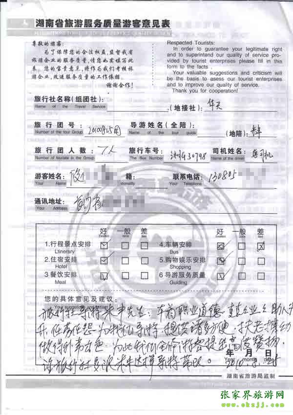 2010年8月25日長沙攸小姐一行7位旅游質(zhì)量反饋:導(dǎo)游特別優(yōu)秀